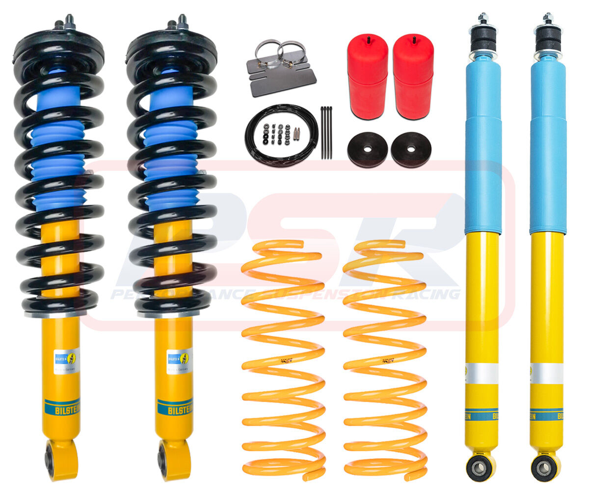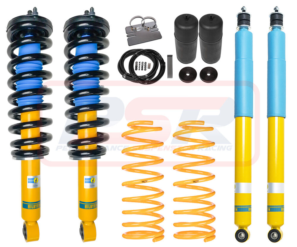 This kit contains Bilstein front struts pre-assembled with PSR front coil springs and HD strut tops, Bilstein rear shocks, King Springs rear coils and Polyair airbag kit.