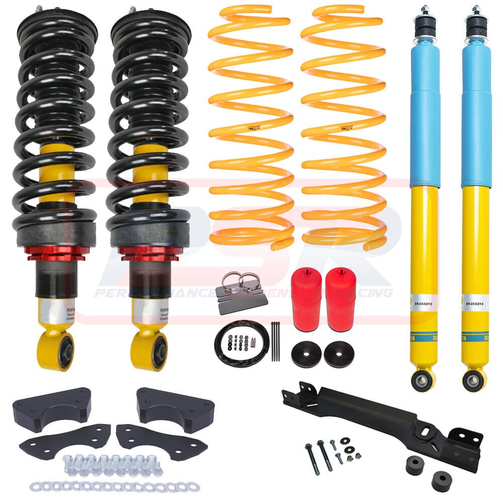 This kit contains PSR spec front struts pre-assembled with PSR front coil springs, HD strut tops and includes a Diff Drop kit, Ball Joint spacer kit, Bilstein rear shocks, King Springs rear coils and Polyair airbag kit.