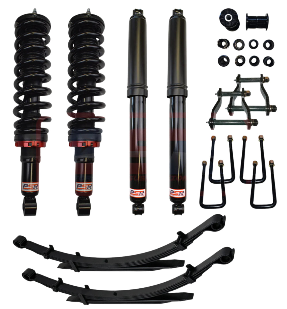 This kit contains PSR TTG front struts all pre-assembled with Kings Coil springs and HD strut tops, leaf springs, U-bolts, new leaf bushes and PSR TTG rear shocks.