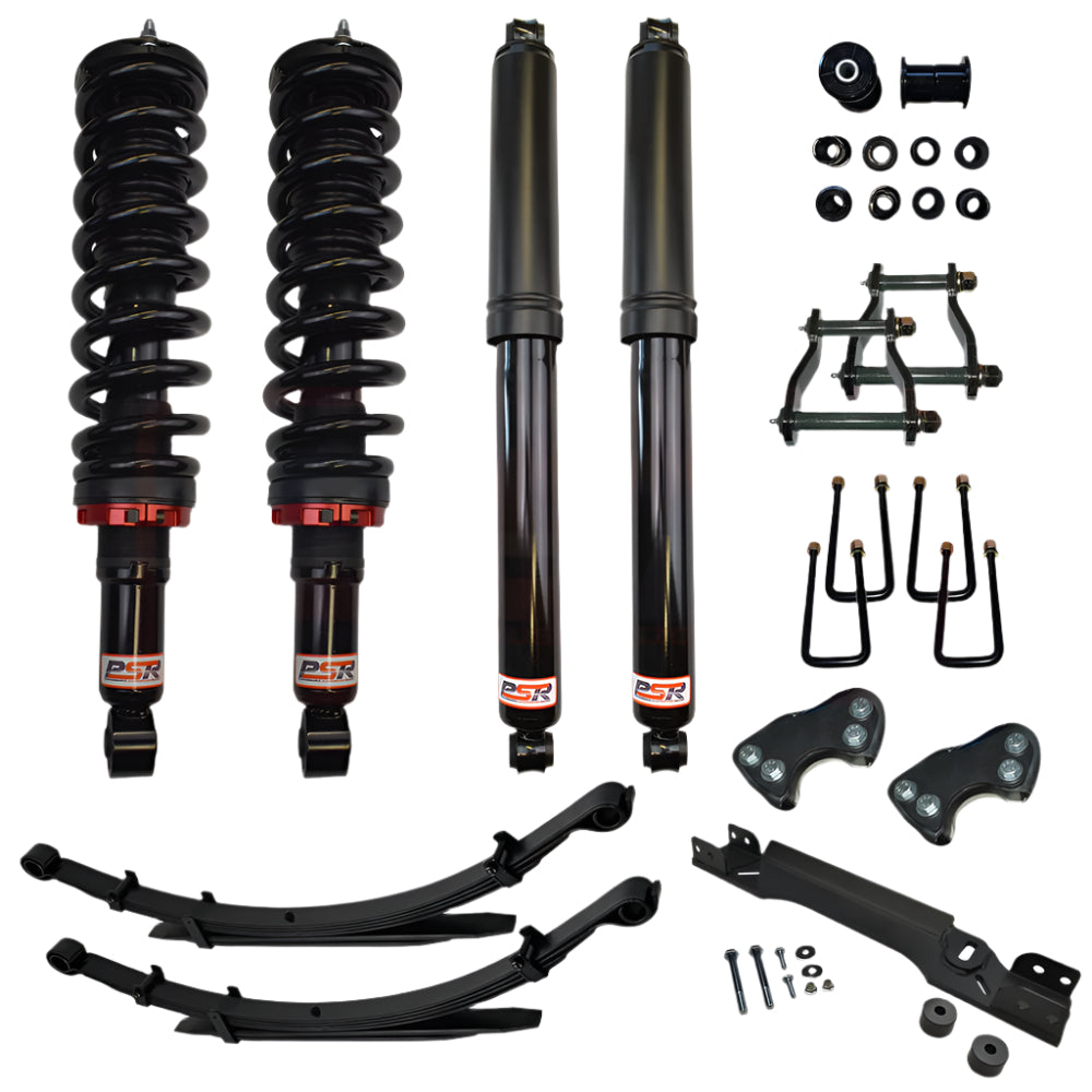 This system sits at 3" front and 2" rear to sit the car level and includes our PSR diff drop kit, PSR ball joint spacer, PSR TTG 2 - 4" height adjustable struts all pre-assembled with Kings Coil Springs, PSR TTG Rear Shocks, 2" leaf springs, leaf spring bushes, greasable shackles and U-bolts.