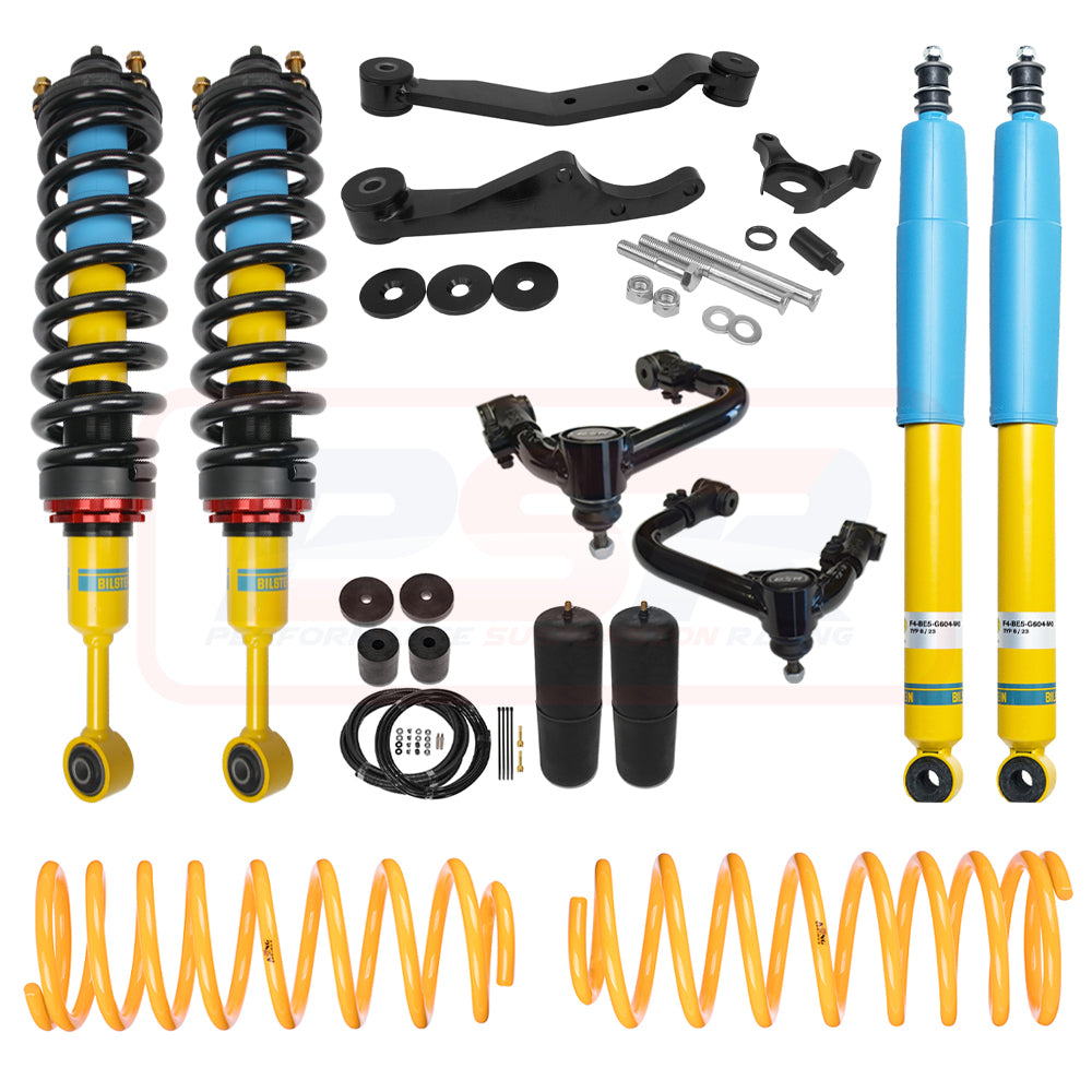 This kit utilises PSR Spec Bilstein adjustable height front struts with PSR coil springs, PSR adjustable upper control arms, PSR arm style diff drop, rear Bilstein shocks, King Springs coils and Polyair airbag kit.