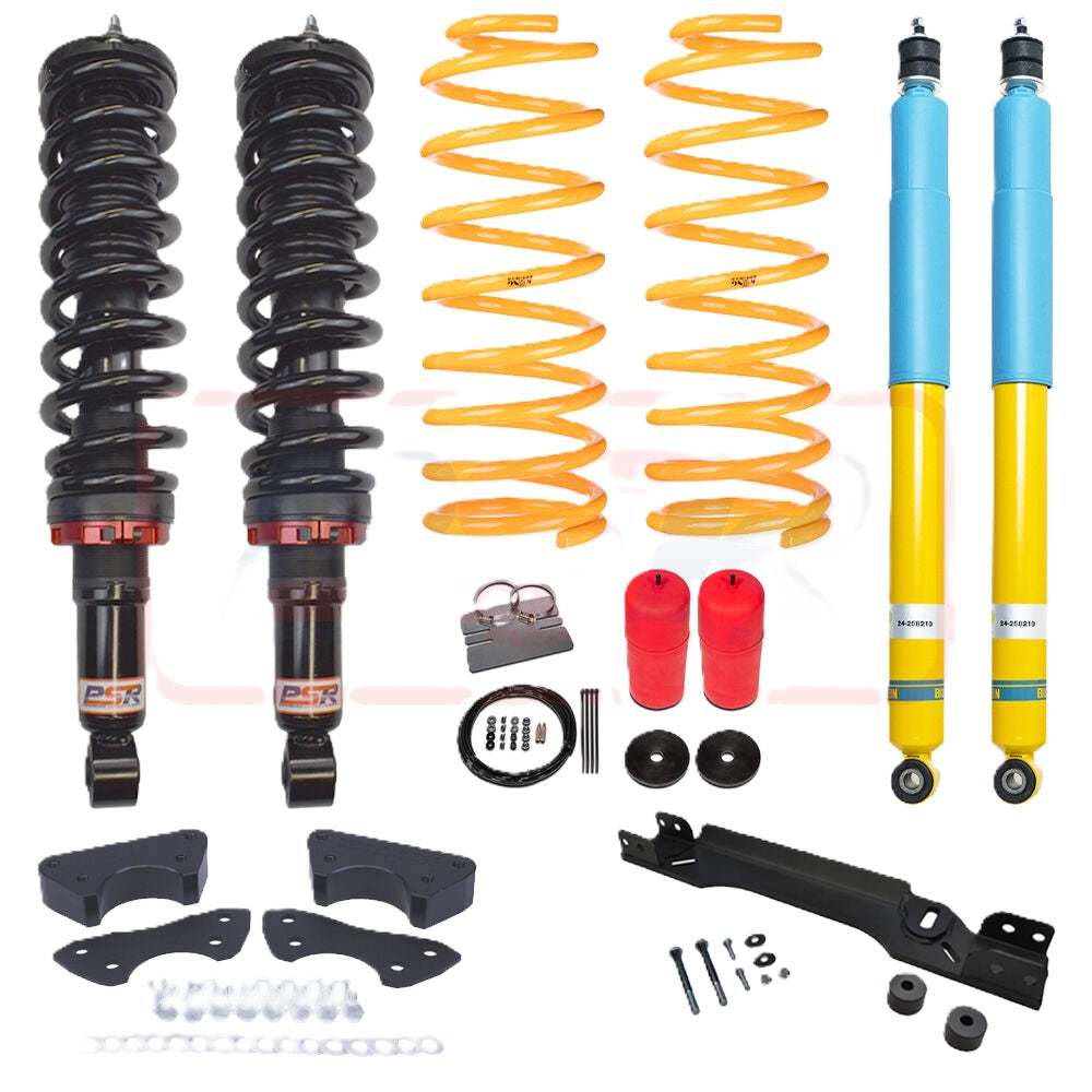 This kit contains PSR TTG adjustable height front struts with PSR front coil springs, HD strut tops and includes a Diff Drop kit, Ball Joint spacer kit, Bilstein rear shocks, King Springs rear coils and Polyair airbag kit.