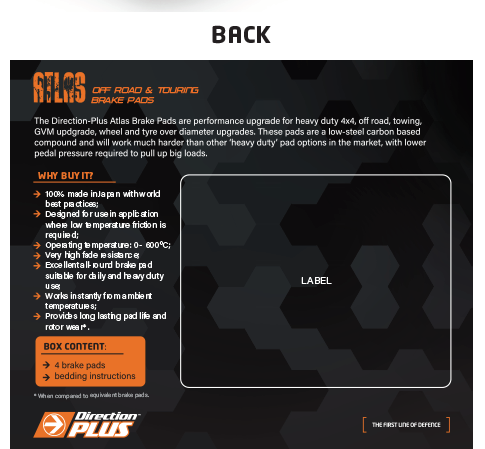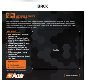 Performance upgrade brake pads for heavy duty and off road as well as towing. This specifically manufactured compound has been designed to be ideal from low temperatures and fade resistant so is suitable for heavy duty and GVM upgrade vehicles. Direction-Plus ATLAS brake pads are a low-steel carbon-based compound and will work much harder than other ‘heavy duty’ pad options with lower pedal pressure required to pull up those big loads.