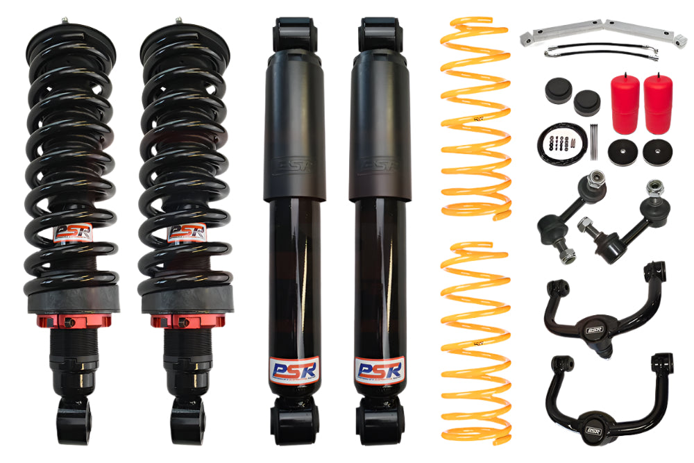 This system sits at 4" front and 3" rear and contains our PSR TTG adjustable height front struts all pre-assembled with PSR coil springs and HD strut tops, PSR upper control arms, HD front link pins, Rear Crossmember Spacer / Lift Kit and PSR TTG rear shocks with King Springs rear coils and Polyair airbag kit.
