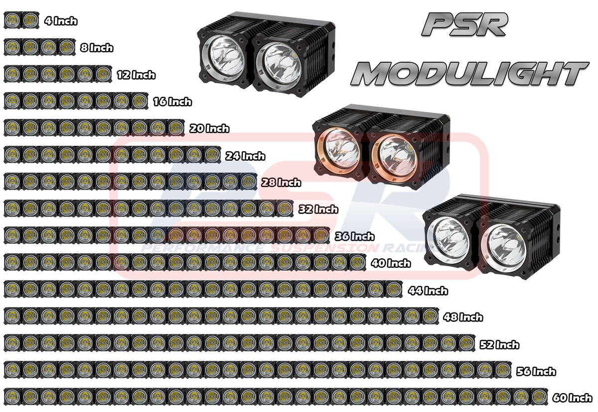 The PSR Modulight LED Lightbar has the flexibility to extend from our smallest 4" to our largest 60" bar with all the common sizes available eg. 20, 32, 40, 52" (click to see the full range). Once purchased you can simply buy additional modules and a new backing support plate to extend to your desired length. Each module contains 2 x 10w producing over 2000 lumens per pair.