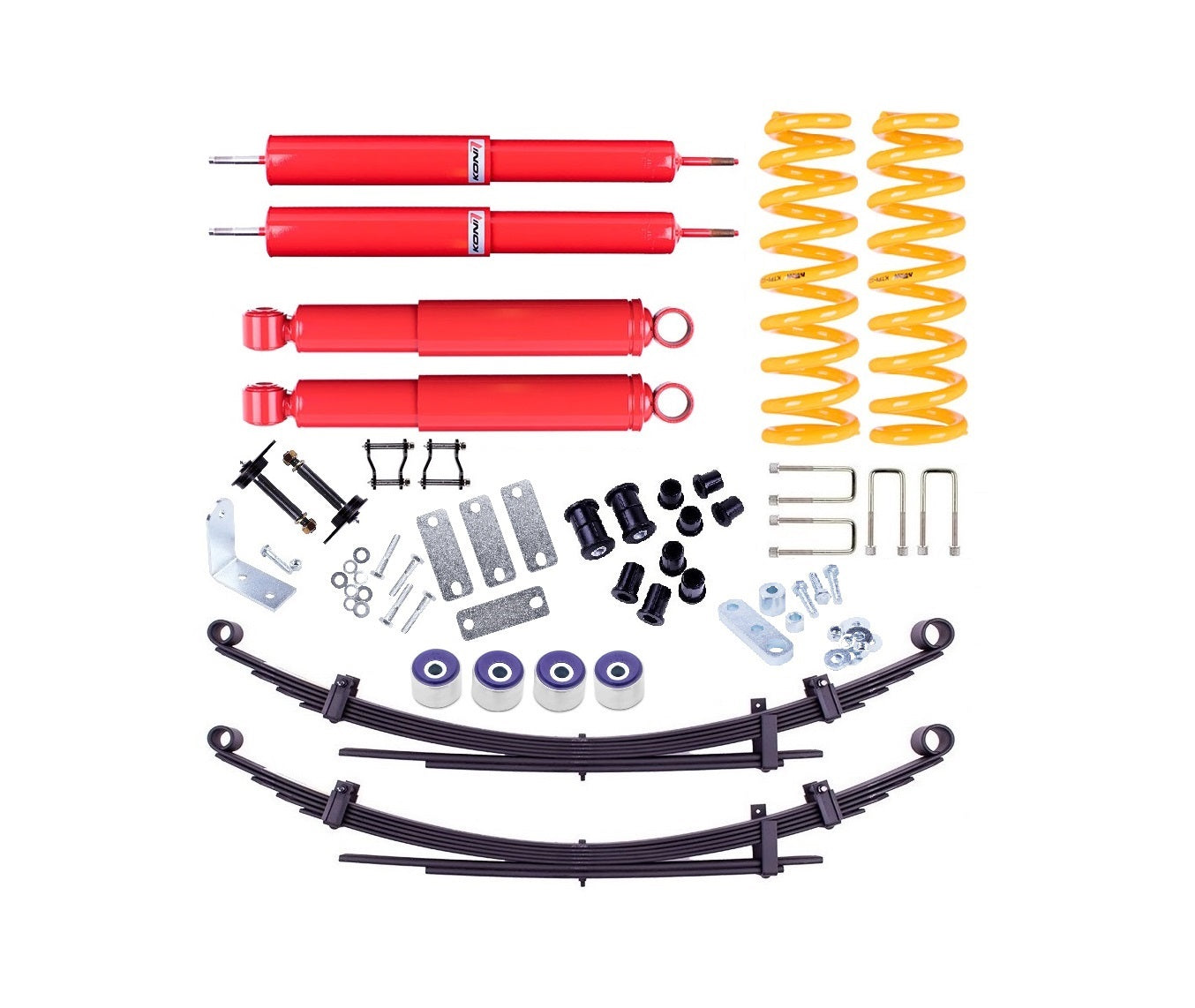 This kit is a complete Suspension Lift Kit with Koni 90 Series Raid Shocks, Front Raised King Coil Springs, Rear Parabolic Leaf Springs and required fitting components.